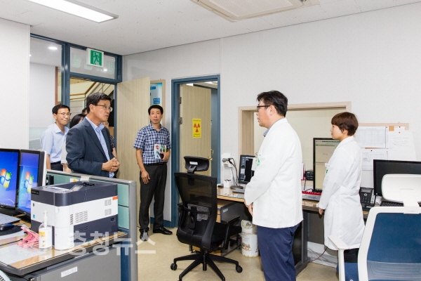 김돈곤 청양군수가 보건의료원을 방문해 현장을 돌아보고 있다