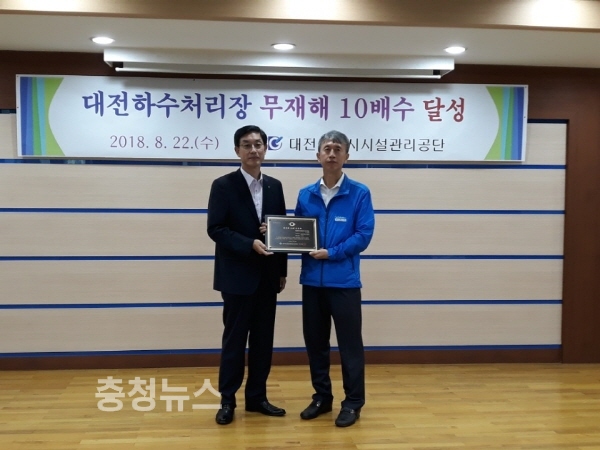 대전시설관리공단(이사장 김근종)은 22일 대전하수처리장이 무재해 10배수를 달성해 한국산업안전보건공단으로부터 무재해 인증패를 수여받았다고 밝혔다.