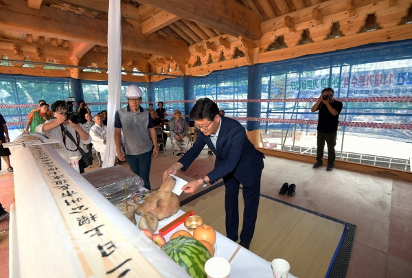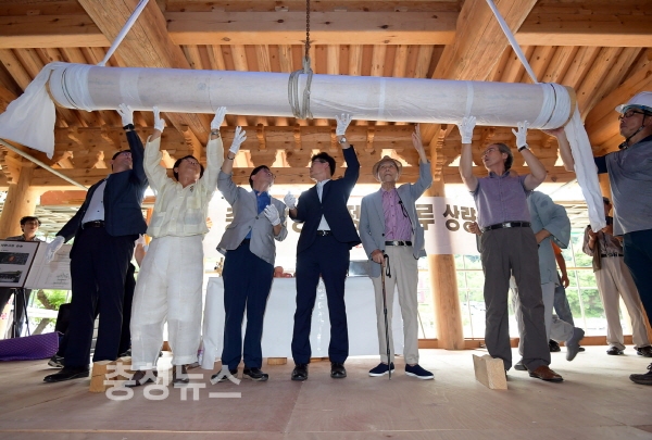 충남 공주시(시장 김정섭)는 지난 22일 공주대사범대학 부속고등학교 정문에 재현하고 있는 충청감영 포정사 문루 상량식을 가졌다.