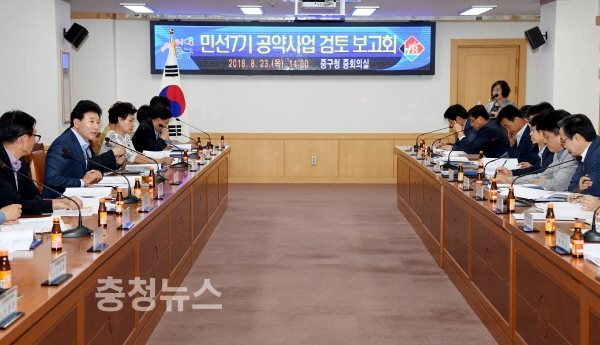 중구의 민선7기 공약사업은 ▲구민회관 건립 ▲제2뿌리공원 조성 ▲독립운동가 거리 조성 ▲안전하고 편안한 복지환경 조성 ▲깨끗한 중구 만들기 등 5대 공약 24개 세부사업이다.