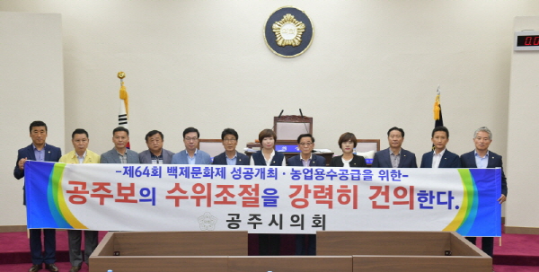 박병수·이상표·이종운·박석순·정종순·박기영·서승열·임달희 의원이 제안하고 이상표 의원이 대표 발의한 건의안 주요내용으로는 “공산성과 금강변 일대에서 매년 백제문화제 행사가 열리는데 물 부족으로 금강 물을 배경으로 한 야경의 아름다움을 선보일 수 없게 되었고 금강 주변 농지에 물이 없어 농작물이 타 들어가고 있는 모습을 바라만 볼 수밖에 없어 안타깝다”며 “가뭄으로 타들어 가는 농민들의 민심을 헤아리고 제64회 백제문화제가 성공적으로 개최될 수 있도록 백제문화제 기간만이라도 공주보 수문을 닫아 물을 확보할 수 있도록 해 달라”고 공주시의회 의원 일동은 강력히 촉구했다.