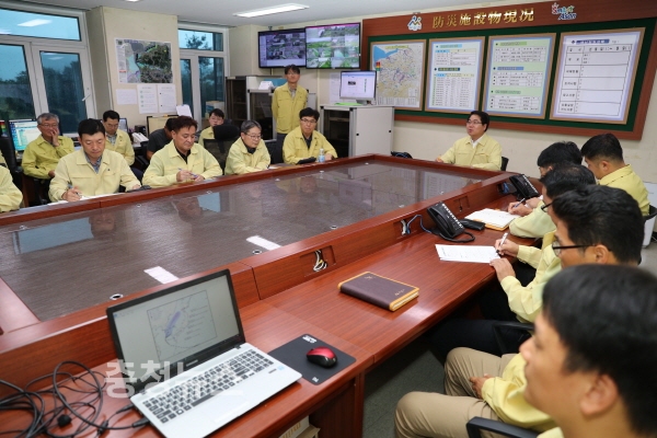 재난상황실에서 오세현 시장을 비롯한 관계자들이 피해 현황에 대해 보고회를 가지고 있다.