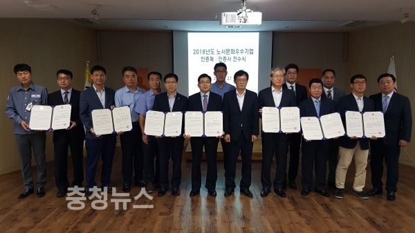 공사(사장 김민기)는 고용노동부 주관 노사문화 추진실적 심사에서 협력적 노사관계 구축으로‘2018 노사문화 우수기업’으로 선정돼 27일 대전지방고용노동청(청장 이명로)으로부터 정부 인증서와 인증패를 전수 받았다.