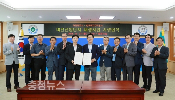 대전시는 27일 오후 시청 중회의실에서 한국토지주택공사와 대전산업단지 재생사업 전면매수구역 사업추진을 위한 시행협약을 체결했다.