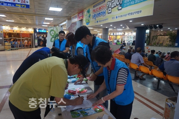 (사)대전소비자공익네트워크 (회장 도정자)는 한국에너지공단 대전충남본부(본부장 김주완)의 후원으로 28일 중앙로지하상가(선화동)에서 아지랑e(아끼자,지키자,사랑하자, energy) ‘에너지빼기 사랑더하기’캠페인을 전개했다.