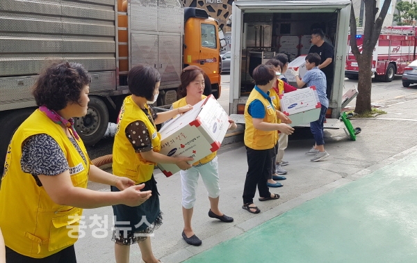 지난 29일 침수로 인해 단전‧단수 피해를 입은 봉명동 한 아파트에 대한적십자사 대전‧세종지사가 긴급구호물품 110세트를 지원하고, 유성구청 직원들과 함께 물품 전달
