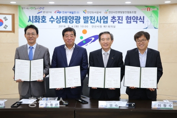 한국서부발전(사장 김병숙)은 4일 안산시청에서 안산시, 안산도시공사, 안산시민햇빛발전협동조합과 “시화호 수상태양광 발전사업” 추진을 위한 양해각서를 체결했다.
