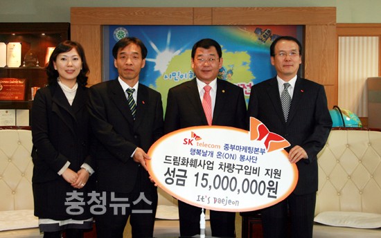 SK텔레콤 중부마케팅본부 김영수 본부장은 대전시에서 추진하고 있는 노숙인 등 취약계층 일자리 창출을 위한 드림화훼사업단에 성금을 기탁하고자 17일 오후3시 대전시청을 방문하여 박성효 시장에게 1,500만원 전달하였다.