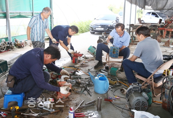 농기계이동수리반과 농업기술센터 직원들이 모터펌프 수리에 구슬땀