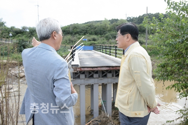 이춘희 세종특별자치시장이 7일 지난 집중호우로 피해가 발생한 문주천 일대 침수지역과 부강면 교량 파손현장을 방문, 인력과 장비를 총동원해 주민피해를 최소화할 것을 주문했다.