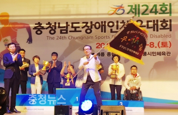 ‘제24회 충청남도장애인체육대회’에서 종합 우승을 차지해 박승복 체육진흥과장이 우승기를 흔들고 있다.