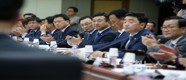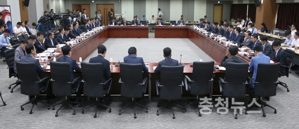 이날 예산정책협의회에는 양승조 지사를 비롯한 도 간부공무원과 민주당 이해찬 대표, 박광온 최고위원, 김태년 정책위 의장, 조정식 예결위 간사, 김현 제3사무(미래소통)부총장, 어기구·강훈식·윤일규·이규희 국회의원 등이 참석했다.