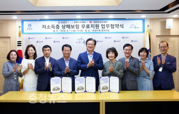 대전 유성구(구청장 정용래)는 11일 구청 중회의실에서 유성구행복누리재단(이사장 김홍혜), 대전유성우체국(국장 김문수)과 함께 저소득층 상해보험 무료지원을 위한 업무협약을 체결했다.