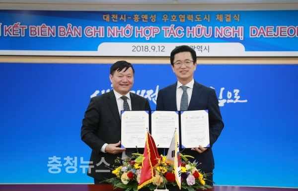 허태정 시장과 베트남 흥옌성 응웬 반 퐁(Nguyen Van Phong) 성장은 12일 오전 시청 중회의실에서 우호협력도시 협약을 체결했다.
