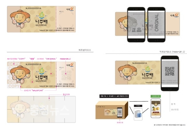 ‘나주배 브랜드 도용 방지 라벨’은 조폐공사의 특허기술인 복사방해패턴을 적용해 복사해 사용할 경우 ‘COPY’ 문구가 나타나 정품이 아님을 알 수 있다. 또 스마트폰 앱인 ‘Hidden QR’을 활용, QR코드에 라벨을 비추면 정품 나주배 여부를 바로 확인 가능하다.