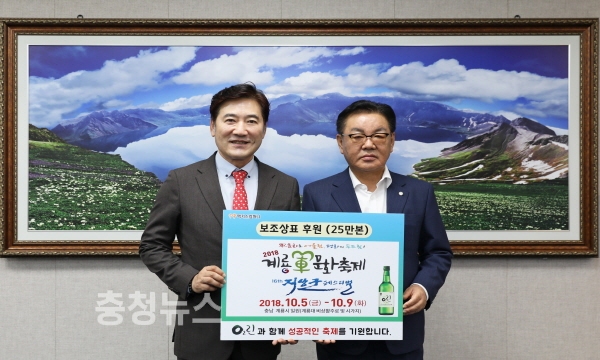 계룡시는 13일 박근태 사장이 시청을 방문해 제11회 ‘계룡군문화축제’ 홍보를 적극 지원하기로 하고 O₂린 소주병 보조라벨 전달식을 가졌다고 밝혔다.