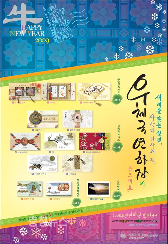‘2009년 우편 연하장’의 종류에는 고급연하카드, 일반연하카드, 청소년카드, 연하엽서 등 13종이 있으며 가격은 320원(연하엽서), 650원(일반연하카드, 청소년카드), 1000원(고급연하카드)이다.
