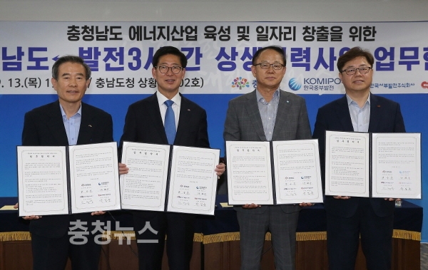 한국서부발전(사장 김병숙)은 13일 충청남도 도청에서 충청남도, 한국중부발전, 한국동서발전과 ‘충남도 에너지 산업 육성 및 일자리 창출을 위한 업무협약’을 체결했다.