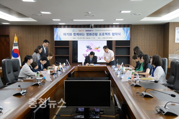 세종시(시장 이춘희)가 14일 시청 집현실에서 CGV세종, MEGABOX세종, 건강가정다문화가족지원센터와 ‘맘스 위드 무비’ 추진 협약을 체결했다.
