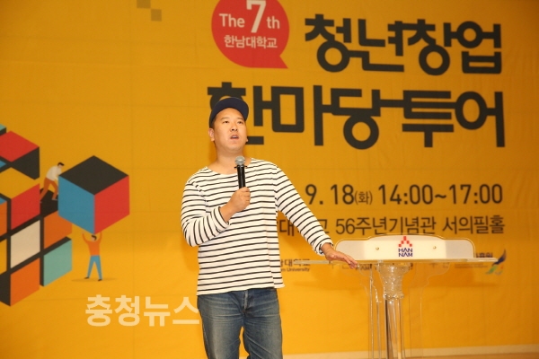 18일 한남대 ‘2018 청년창업 한마당투어 Play&Talk‘에서 장진우 대표가 강연을 하고 있다.