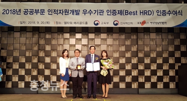 공공부문 인적자원개발 우수기관 인증 수여식에서 김병찬 인재개발원장(왼쪽에서 세번째)과 최진백 교육기획부장(왼쪽에서 두번째)