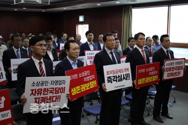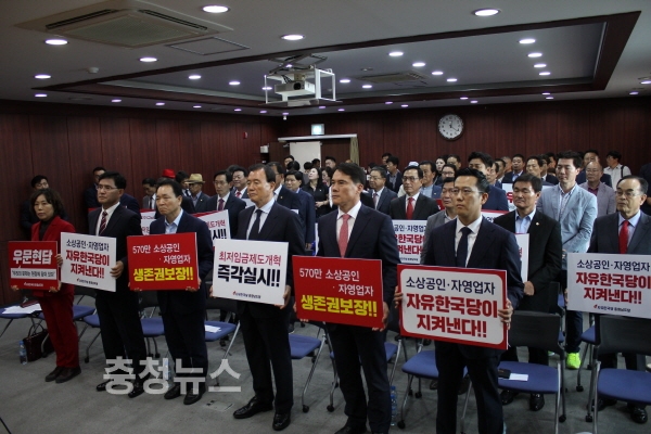 자유한국당 충남도당은 20일 오전 당사 사무실에서 이창수(천안병 당협위원장) 위원장 취임식과 함께 '소상공인․자영업자 생존권 확보를 위한 최저임금 제도개혁 범국민 서명운동 선포식'을 개최했다.