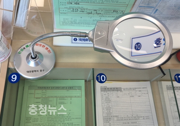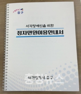 대전 중구(구청장 박용갑)는 시각 장애인과 노약자를 대상으로 민원업무 편의제공을 위해 점자 민원안내 책자와 확대경을 제작해 구 민원실과 17개 동 주민센터 민원실에 비치했다고 26일 밝혔다.