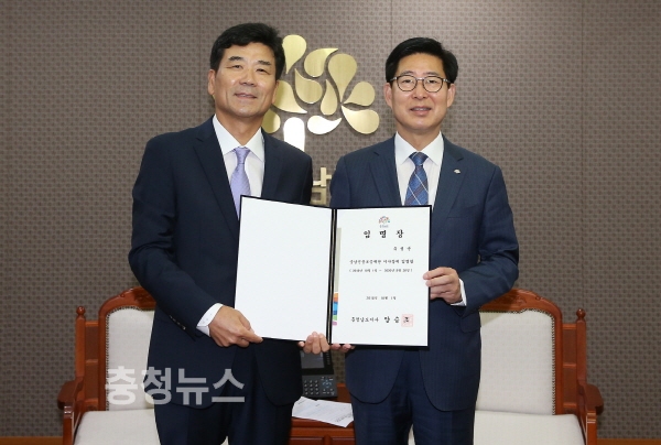 양승조 충남도지사는 27일 도청 접견실에서 유성준 제10대 충남신용보증재단 이사장에게 임명장을 수여했다.