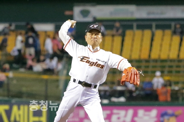 구본영 천안시장이 지난 27일 대전 한화이글스파크에서 열린 한화이글스와 두산베어스의 KBO 프로야구 경기에서 ‘2018 대한민국 국제농기계자재박람회’ 성공 개최 기원과 홍보를 위해 시구를 했다.