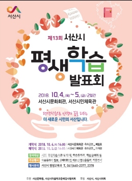 제13회 서산시평생학습발표회가「평생학습으로 인생의 꽃을 피우는 더 새로운 시민의 서산입니다.」를 주제로다음달 4일, 5일 양일간 서산문화회관과 시민체육관에서 열린다.