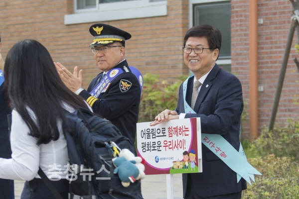 최교진 세종시교육감(사진 오른쪽)과 김정환 세종경찰서장(사진 왼쪽) 등교하는 학생들 격려