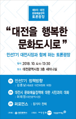 대전문화연대와 공동 주관으로 진행되는 제9차 대전문화예술정책 토론광장은 김종남 새로운 대전위원회 위원의 ‘대전을 행복한 문화도시로’라는 주제의 발제를 통해 민선 7기 정책방향에 대해 청취하고, 이어서 참석한 시민과 함께 논의하는 자리를 갖는다.