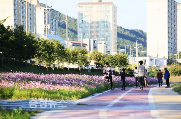 산책로와 자전거도로에 대천1동 400m의 구간 코스모스 화단 조성