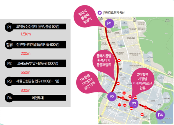 개막 첫날 눈여겨볼 프로그램으로는 첫날 저녁 개막행사에 앞서 도담동 싱싱장터에서 출발해서 세종청사 고용노동부를거쳐 호수공원(약 3㎞)까지 펼쳐지는 시민퍼레이드다.