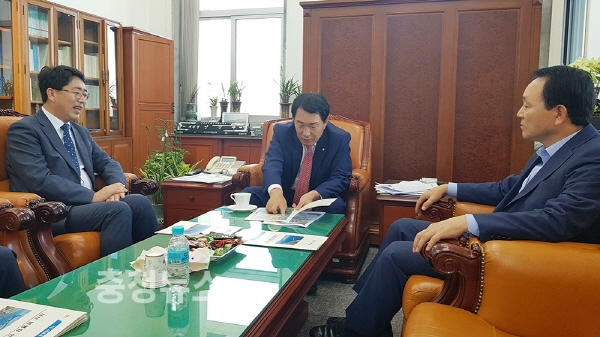맹정호 서산시장이 안상수 예산결산특별위원장과 성일종 의원을 만나 지역현안을 논의하고 있다