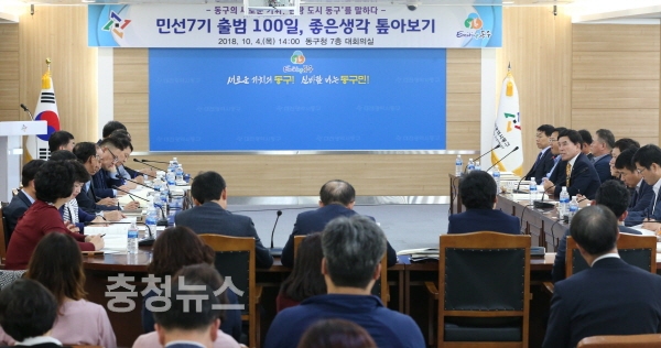 대전 동구(구청장 황인호)는 민선 7기 출범 100일을 앞두고 4일 구청 7층 대회의실에서 동구의 새로운 가치, ‘관광 도시 동구’를 주제로 직원들의 다양한 아이디어를 들어보는 ‘좋은 생각 톺아보기’ 행사를 개최했다.