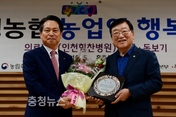 김석환 홍성군수가 5일 농업·농촌 발전에 기여한 공로를 인정받아 김병원 농협중앙회장으로부터 감사패를 받았다.