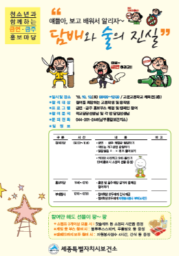 세종시보건소(소장 이강산)가 ‘청소년과 함께하는 금연·금주 홍보마당’ 행사를 추진한다.