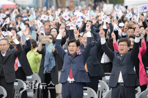 우측으로 최교진 교육감 , 이춘희 시장 만세 삼창
