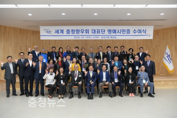 논산시(시장 황명선)는 지난 10일 시청 회의실에서 미국, 호주, 독일 등 14개국에서 활동하고 있는 세계 충청향우회 대표단 31명에게 논산시 명예시민증을 수여했다.