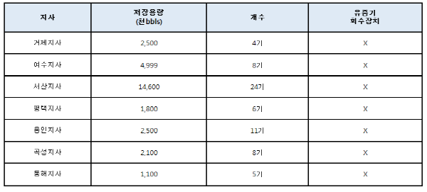 GS칼텍스, SK에너지 등 국내 6개 정유사 역시 1945개의 저장탱크에 1억 6천만배럴 이상을 보유하고 있지만, 현행 소방법에는 의무화 규정이 없어 유증기 회수장치 설치 여부에 대해서는 구체적인 실태조사가 이뤄진 적이 없다.