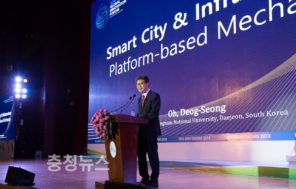 충남대 오덕성 총장은 지난 11일, 베트남 빈증성 빈증(Binh Doung) 컨벤션센터에서 개최된 ‘제20차 WTA 총회 및 UNESCO 세계혁신포럼’의 개회식 직후 ‘스마트시티와 사회기반시설 : 플랫홈 기반 매커니즘’을 주제로 기조 강연을 펼쳤다.