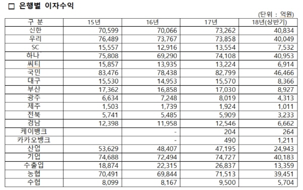 이중 4대 시중은행(KB국민 신한 우리 KEB하나은행)의 이자이익이 10조 7,500억원으로 상반기 기준 4대 은행의 이자이익이 10조원을 웃돈 것은 하나·외환은행이 통합된 2015년 이후 처음이다.