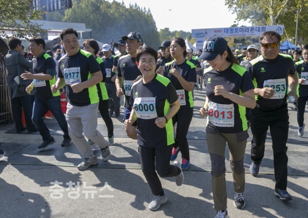 특히 이름부터 남다른 ‘거북이마라톤동호회’가 작년에 이어 올해도 단체 팀으로 멀리 김천에서 찾아왔다. 정밀화학기업 KCC 김천공장 직장동호회팀으로 최홍섭 총무는 “코스 주변 풍경이 너무 매력 있고, 대청호 대회만의 가족적인 분위기가 무엇보다 좋다”며 참가 소감을 밝혔다.