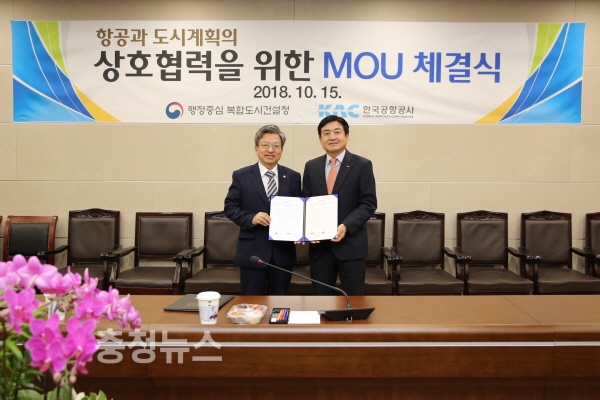 행복청(청장 이원재)과 한국공항공사(사장직무대행 김명운)는 15일 청주공항에서 상호 협력체계 구축을 위한 업무협약을 체결했다.