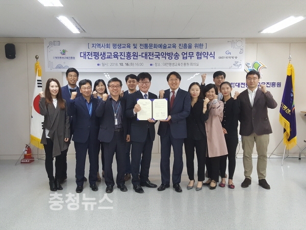 대전평생교육진흥원(원장 금홍섭)과 대전국악방송(국장 김재영)이 16일 대전평생교육진흥원 회의실에서 ‘지역 평생교육 및 전통문화예술교육 진흥을 위한 업무협약’을 체결했다.