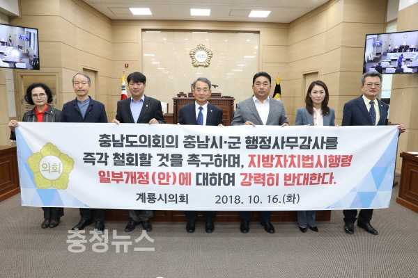 이어 계룡시의회는 '충남도의회의 충남시·군 행정사무감사 철회 및 지방자치법시행령 일부개정(안) 반대 촉구 성명서'를 채택 발표했다.