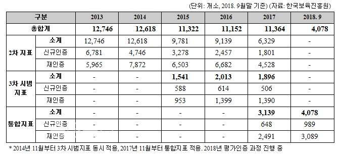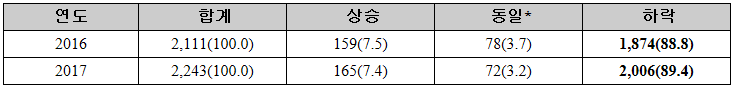 하지만 ‘불시점검’ 앞에서는 상황이 달랐다. 평가인증 대비 확인점검 변동 상황을 확인한 결과 당초 평가 점수에 비해 하락한 경우가 압도적으로 많은 것으로 나타났다. 2016년과 2017년 확인점검 결과는 다음과 같다.