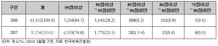 이 중 90점 이상 고평가를 받은 어린이집이 다수인 것으로 나타났다. 2016년에는 총 1만1152곳 중 93%인 1만357곳이, 2017년에는 8224곳 중 7904곳(96%)이 90점 이상을 받은 것으로 나타났다.