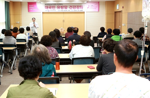 충남대병원 대전지역암센터(소장 김지연‧ 외과 교수)는 18일 오후 암센터 2층 의행홀에서 10월 유방암의 달을 맞아 ‘유방암 유(乳)비무환 핑크리본 캠페인 건강강좌’를 열었다.